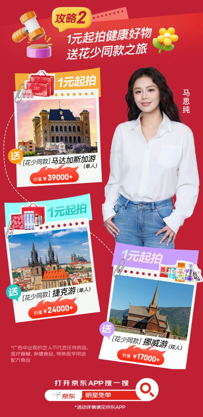 成功拍得组套的消费者,除获得健康好物外,还将获赠《花少7》同款治愈之旅、花少姐姐签名JOY等福利。不同产品组套对应不同路线,涵盖埃及、马达加斯加等热门旅行目的地,让消费者在收获健康的同时,拥有开启“花少式”旅行的机会。即刻起,搜索“京东拍卖”即可参与。