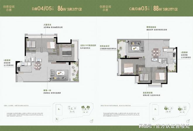 86-88㎡三房两厅一卫(竖厅格局)86㎡:东北或西南朝向,次卧 8.34-8.97㎡,L 型厨房。88㎡分离(淋浴、马桶、洗手立分区)。优势:三开间朝南,主卧带飘窗,采光优于同面积段竞品。