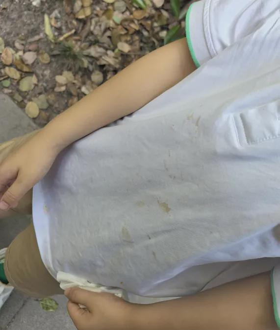 “每天放学看到娃,身上星星点点都是像酱油一样的污渍。有天送他去画画,我在门外想起,下课的时候一看已经来不及了,勾线笔划到了校服的袖子和前胸。